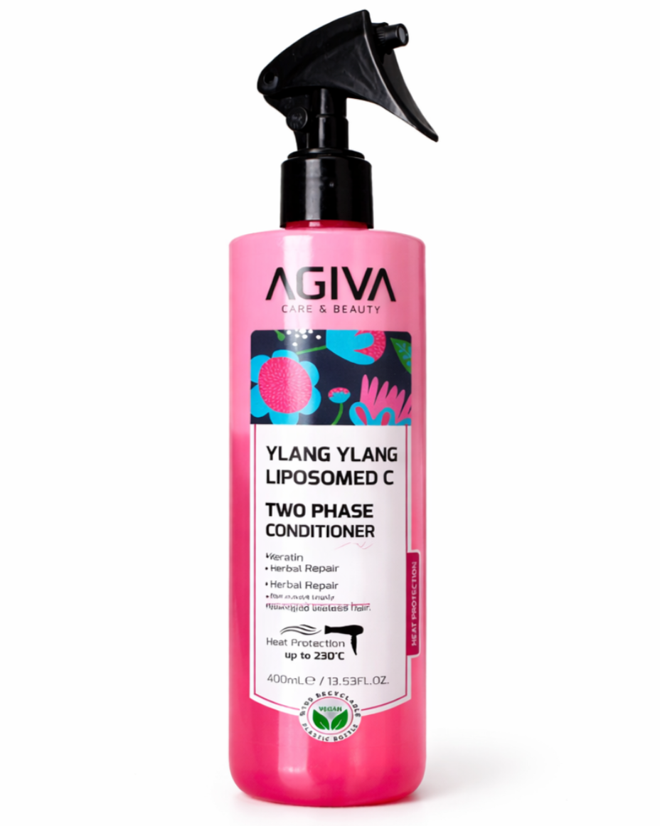 AGIVA Ylang Ylang ir divfāžu kondicionieris spreja veidā, kas paredzēts matu mitrināšanai, atjaunošanai un aizsardzībai. Tā vieglā formula palīdz nogludināt matus, samazina pūkošanos un padara tos mīkstus un viegli ķemmējamus.